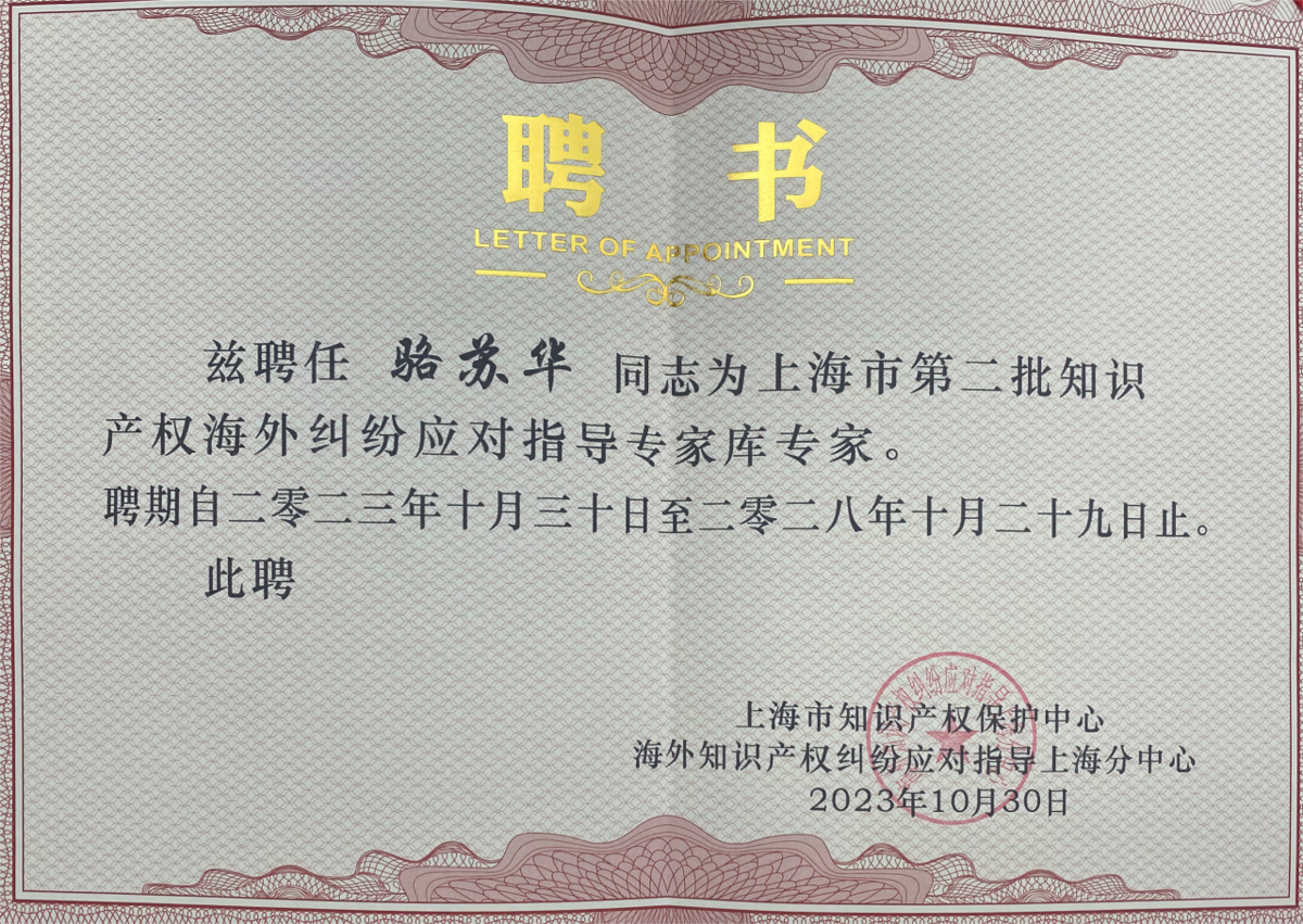 >虎扑电竞>新闻动态>集佳上海分所骆苏华、李擘获聘成为上海市第二批知识产权海外纠纷应对指导专家库专家