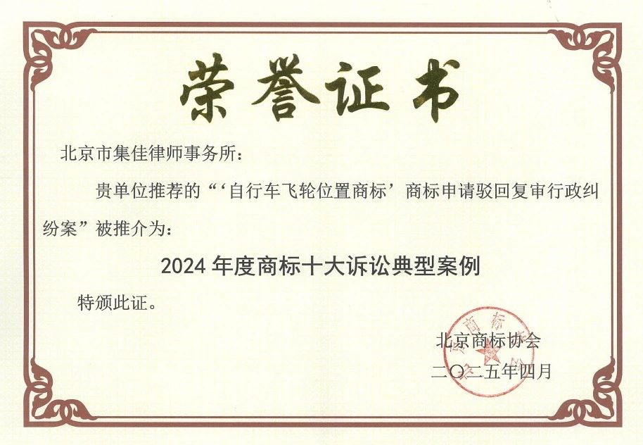>虎扑电竞>关于我们>荣誉概览>2025>集佳代理“自行车飞轮位置商标”行政纠纷案入选北京商标协会年度十大诉讼典型案例