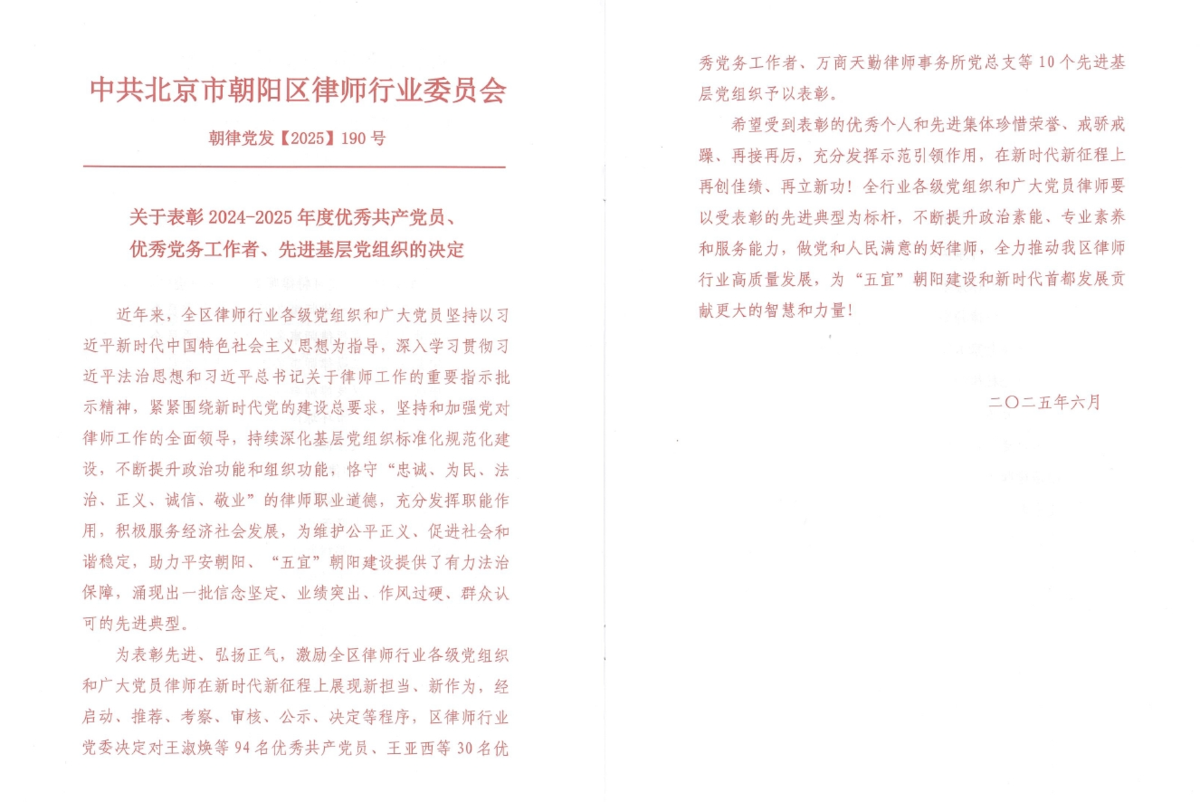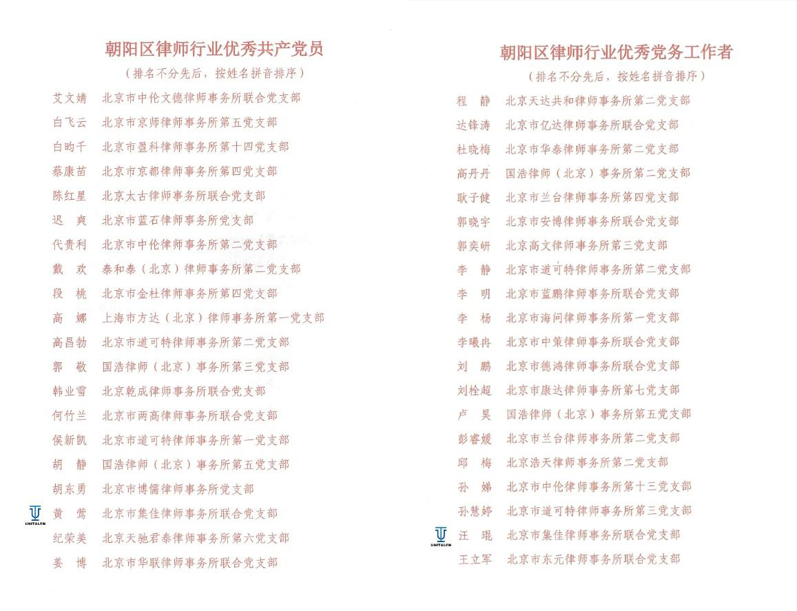 6月27日,朝阳区律师行业党委召开了朝阳区律师行业庆祝中国共产党成立104周年暨总结表彰大会,虎扑电竞联合党支部党员黄莺荣获“朝阳区律师行业优秀共产党员”称号,支部党员汪琨荣获“朝阳区律师行业优秀党务工作者”称号。